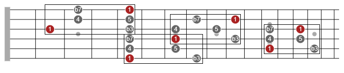 In the next diagram, you’ll see how all the above patterns fall on the fretboard and cover a fairly large portion of it.